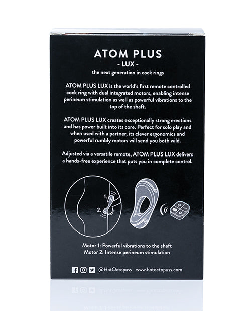 Look, no hands! Thanks to the introduction of ATOM PLUS LUX's versatile remote, you can now seamlessly switch between settings without ever needing to touch the toy. Its legendary design continues to deliver deep perineum stimulation as well as intense vibrations to the top of the shaft, leading to an incredible climactic experience. Remote-control operated cock rings. With dual integrated motors that deliver intense perineum stimulation as well as powerful vibrations on top of the shaft, the ATOM PLUS LUX cock ring has power built into its core. When used with a partner, its clever ergonomics, powerful rumbly motor and versatile remote, will send you both wild. Not into sharing? Well you're in luck. The ATOM PLUS LUX is perfect for intense SOLO sessions. The unique sensation that perineum stimulation provides during masturbation can lead to a heightened experience that results in an extremely powerful and intense orgasm via powerful remote controlled stimulation. Wetter is better. The ATOM PLUS LUX cock ring is 100% waterproof, so you can enjoy it in the shower, bath or hot tub. Just make sure you keep the remote control dry HOW DO I PUT THE ATOM PLUS LUX ON? Firstly, when you receive your brand new ATOM PLUS, give it a really good stretch to loosen it up. Don't be concerned if the toy makes slight cracking sounds - this is normal. Hold the toy horizontally with both hands and stretch the toy in order to elongate the hole. Now drop your balls through the gap. Turn the toy vertically and push your flaccid penis through the gap. You are now ready to turn the toy on and enjoy. CAN I PUT THE TOY ON ONCE I HAVE AN ERECTION? No, you need to be either completely flaccid or semi-flaccid in order to put the toy on. Material: Silicone .ABS Colour: Black Function: 5 Speeds, 5 vibration modes with adjustable frequency USB rechargeable, cord included. Charging Time: 2h Running Time: 40-minutes IPX7 Waterproof. One Year Warranty.