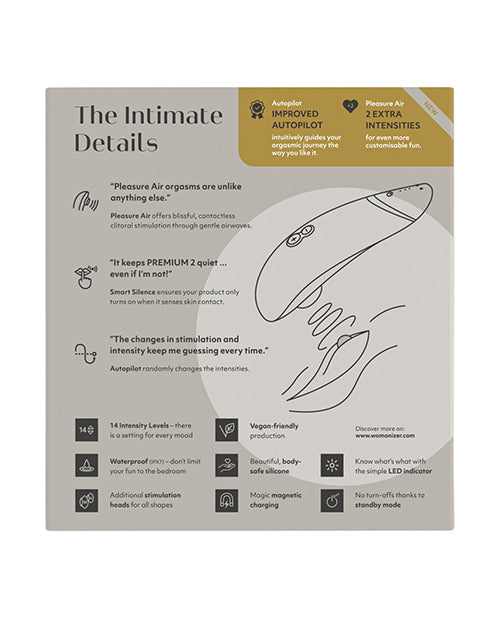 Womanizer PREMIUM 2 with the original Pleasure Air technology is our most luxurious creation yet - truly the Prada of sex toys, the ultimate toy for women who are looking for more than just another device to play with. With more intensity levels than ever before and an improved Autopilot function to take you on new, unpredictable adventures, PREMIUM 2 is the purest pleasure at the highest quality. 14 Intensity levels - Whether you prefer soft and gentle or powerful and intense, or something in between - your next orgasm is just the push of a button away. The intensity levels are perfectly balanced and offer the right setting for your every mood. Extra Stimulator Head - We know that every body is different and beautiful! For this reason, every box includes two sizes of stimulator heads to ensure that everyone can enjoy their WOMANIZER. Autopilot 2.0 - When active, your toy will alternate between intensity levels and keep you on your toes. Sometimes intense, sometimes gentle - always extraordinary. Our Autopilot mode was developed in response to feedback from our testers - an improved feature that users love. Smart Silence - Innovative Smart Silence Technology lets you indulge in your desire. The toy only starts when it meets your skin. If you're not using it, the toy goes into standby mode. This not only makes the toy quieter to use but keeps you in the moment without distraction. Materials: Body-safe silicone, made without phthalates, BPA or latex Dimensions: 155 mm x 50 mm x 35 mm USB rechargeable Run Time - 240 min Charge Time - 120 mins IPX7 Waterproof. Five Year Warranty.